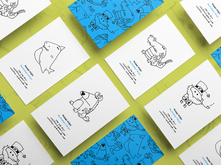Andrew McKee designed these business cards for Michael Steffen, an illustrator and designer. The first impression? An uplifting and happy mood for sure – just look at the drawings on the business card! “Michael Steffen considers himself a glass illustrator/designer…