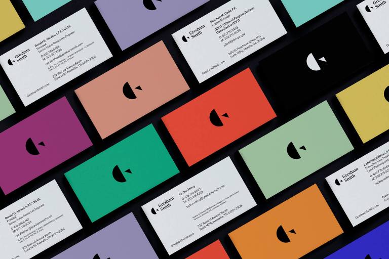 Brit Blankenship and Jason Combs designed these business cards for Gresham Smith, an international architecture and engineering firm. “We were inspired by their brand promise: Genuine Ingenuity,” Brit said. “This informed the half circle and upward, progressive arrow for our…